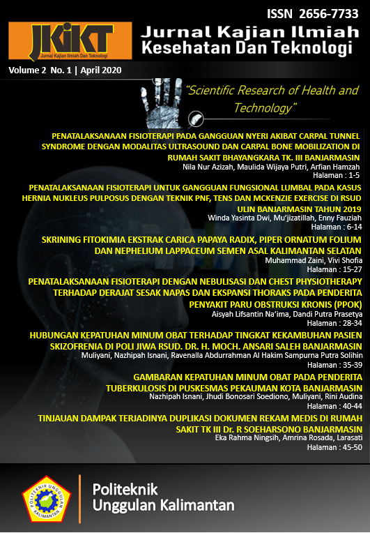 JKIKT : The Journal of Scientific and Health Studies Journal - Vol.2 No 1, April 2020 | ISSN : 2656-7733| Editor in Chief : Dienny Redha Rahmani, S.Si., M.S | Managing Editor : Arfian Hamzah,S.Ft., M.Erg | Published By : POLITEKNIK UNGGULAN KALIMANTAN | website : www.polanka.ac.id | email : jkikt.jurnal@gmail.com | phone : (0511) 431 5505